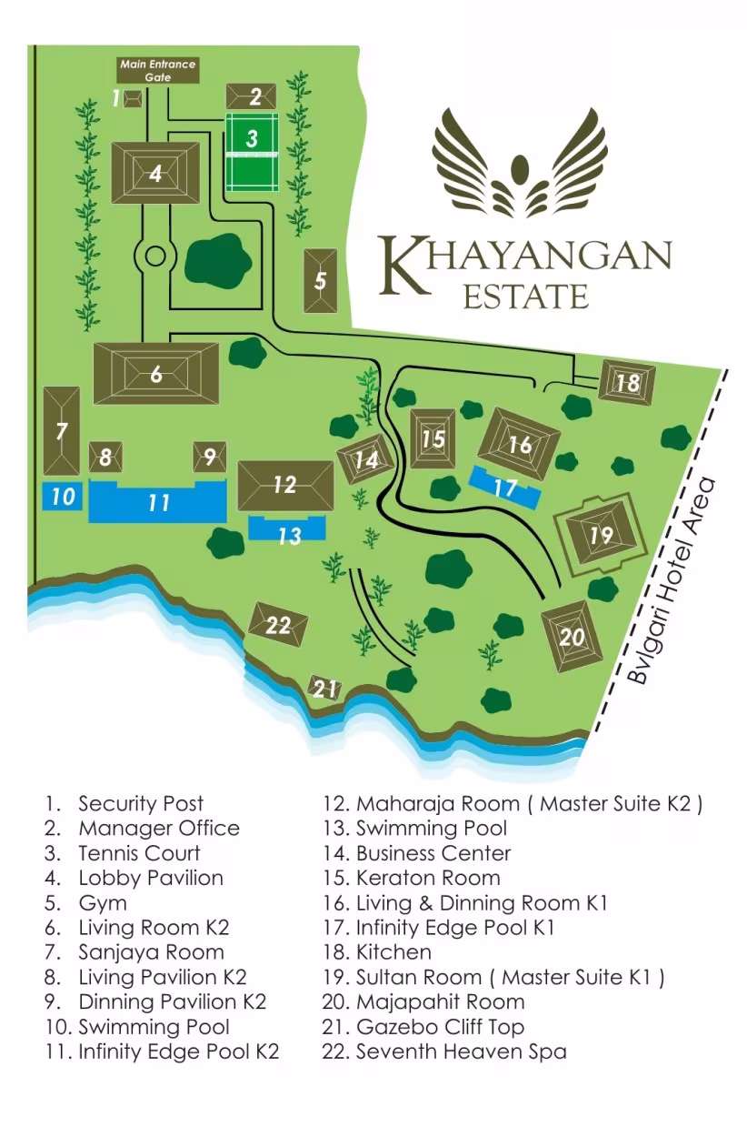 Khayangan Estate is laid out as two clusters, each featuring three, self-contained, Bali luxury villas. Each of these Bali villas presents a bedroom with an en-suite bathroom. The estate is available for two parties of six persons or as a single residence of six bedrooms accommodating up to 12 guests. Cluster 1 consists of three suites – the Sultan, the Majapahit and the Keraton, together with a dining and living pavilion fronted by an infinity-edge pool overlooking the Indian Ocean. Sitting higher and closer to the edge of the cliff, Cluster 2 features two joglos, the Maharaja suite and the two-bedroom Sanjaya suite, each with large private plunge pools. The suites are situated on both sides of a second infinity-edge swimming pool, which leads up to the covered terrace in front of a grand living and dining pavilion. Each suite is exclusively designed and decorated to enhance its individual character. Every bedroom features a majestic king-sized bed set within thick wooden central pillars under a beautifully and intricately carved pondopo or multi-tiered ceiling centre-piece.