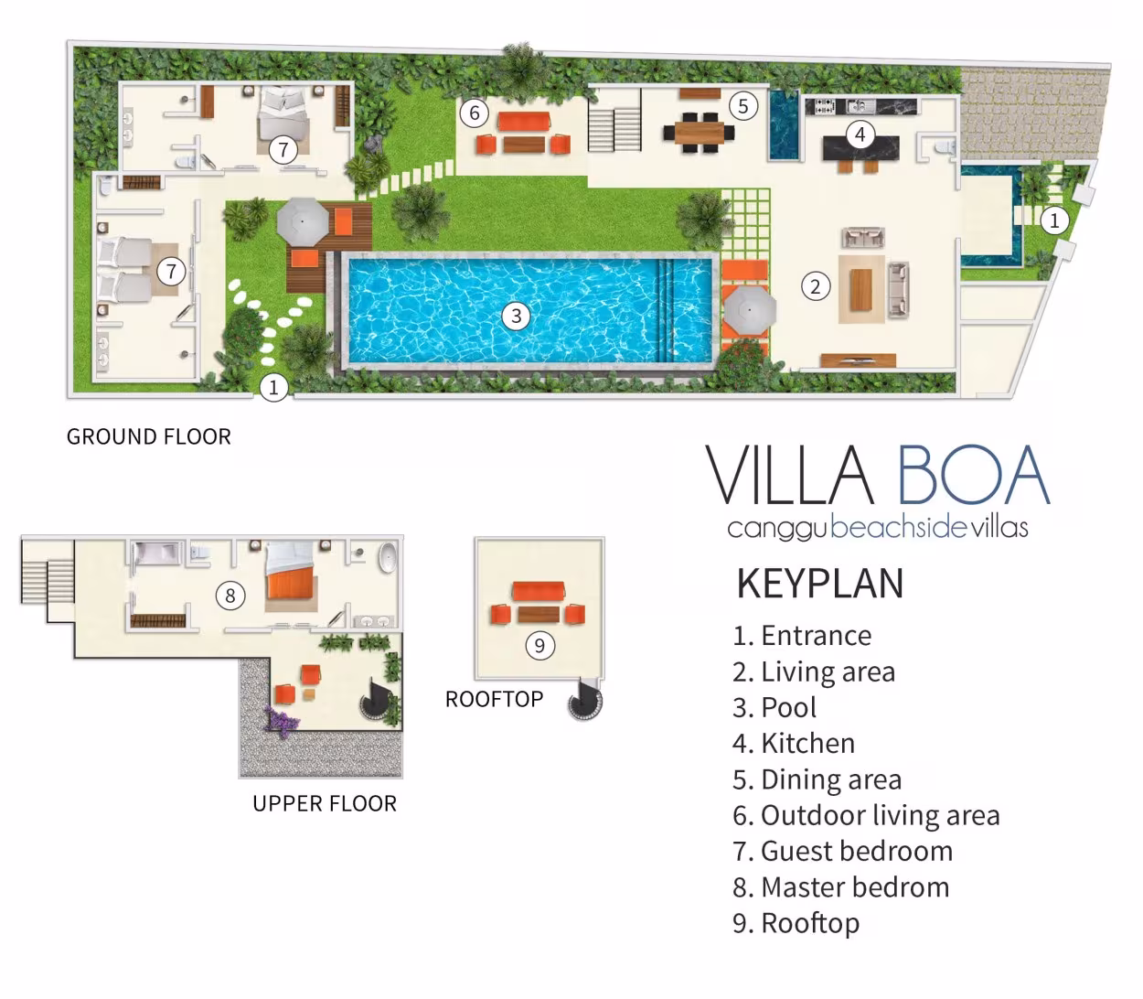 From Villa Boa’s entrance and patio garden is an open-plan kitchen overlooking the garden and the private pool and a tropical alfresco lounge. Beyond is an outdoor dining area and a staircase leading up to the master bedroom and a spacious terrace on the first floor. More stairs lead to the roof terrace. Two guest bedrooms are located in a separate annex to the rear of the garden.